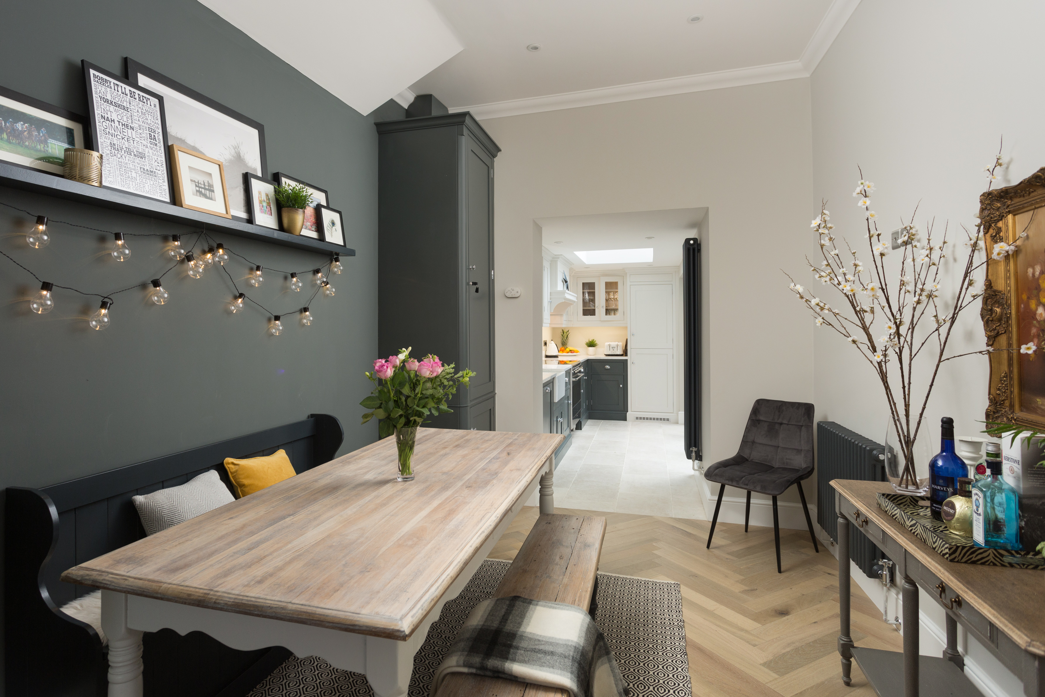 The dining room features herringbone oak flooring, a large farmhouse table with monks bench, further bench and chairs, comfortably seating 8. It also features a great antique painting on the wall.